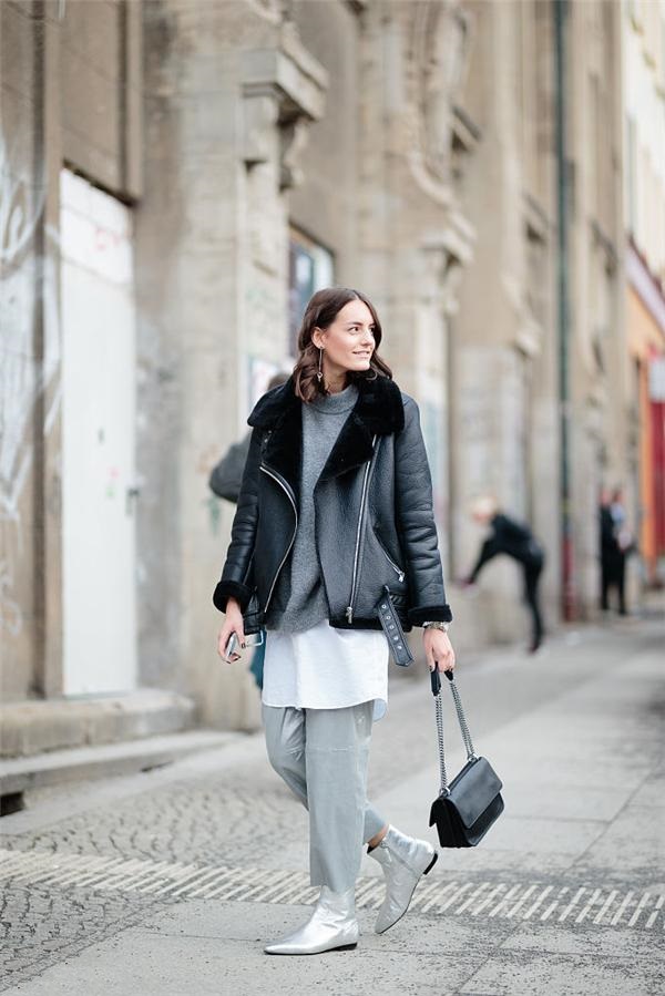 對於皮裙長靴這種女人味十足的搭配,毛毛翻領夾克正好中和了過於甜膩性感的風格。