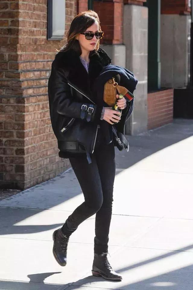 一條緊身牛仔褲和馬丁靴就完成了造型,日常這樣就可以出門了。
