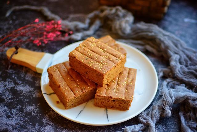 食材:紅棗肉70克、牛奶75克、雞蛋4個、紅糖90克、低筋麵粉110克、玉米油40克、熟白芝麻適量