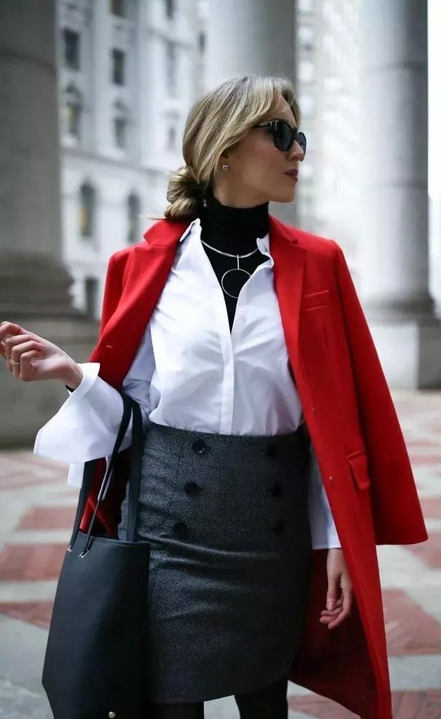 那麼一件格紋西裝的長度就剛剛好,配上闊腿褲還有點復古的味道。3.有時候想更時髦或驚艷一點?黑色高領衫+出彩半裙