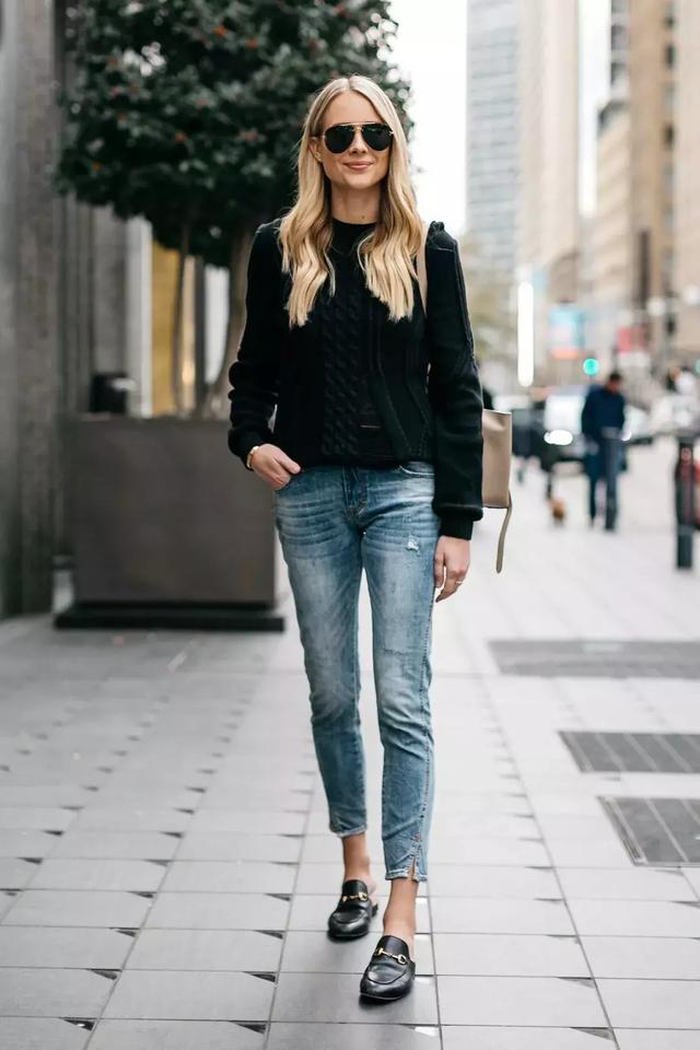 Karlie Kloss和很多博主會在黑色西裝和打底衫下面穿上一條牛仔褲,