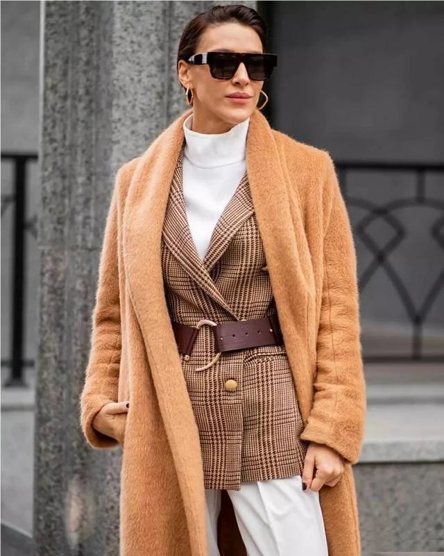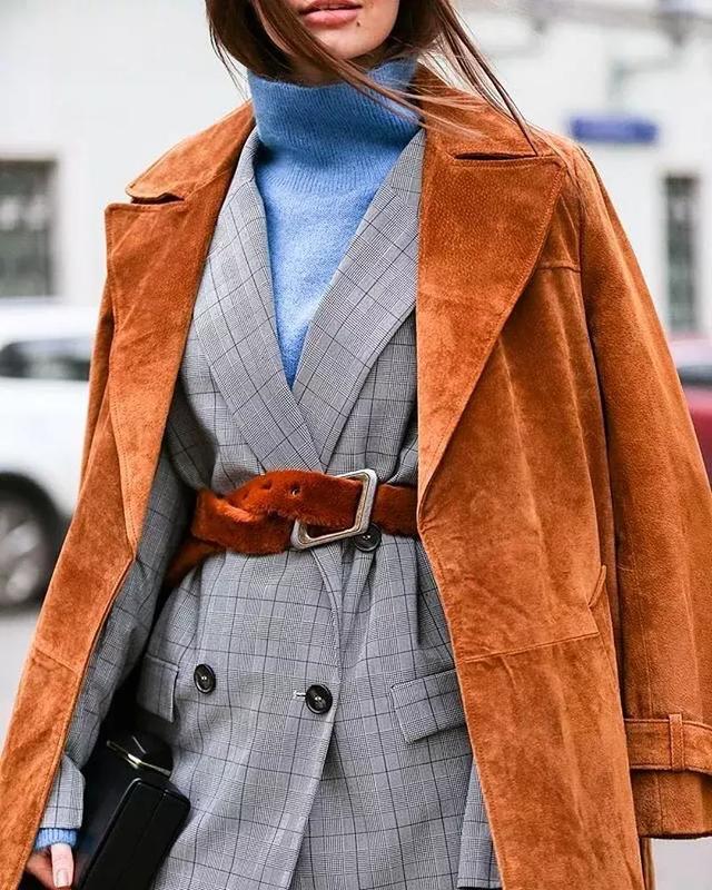 灰色的格紋大衣搭配淺咖色高領衫,簡約乾淨整體造型特別高級有味道。