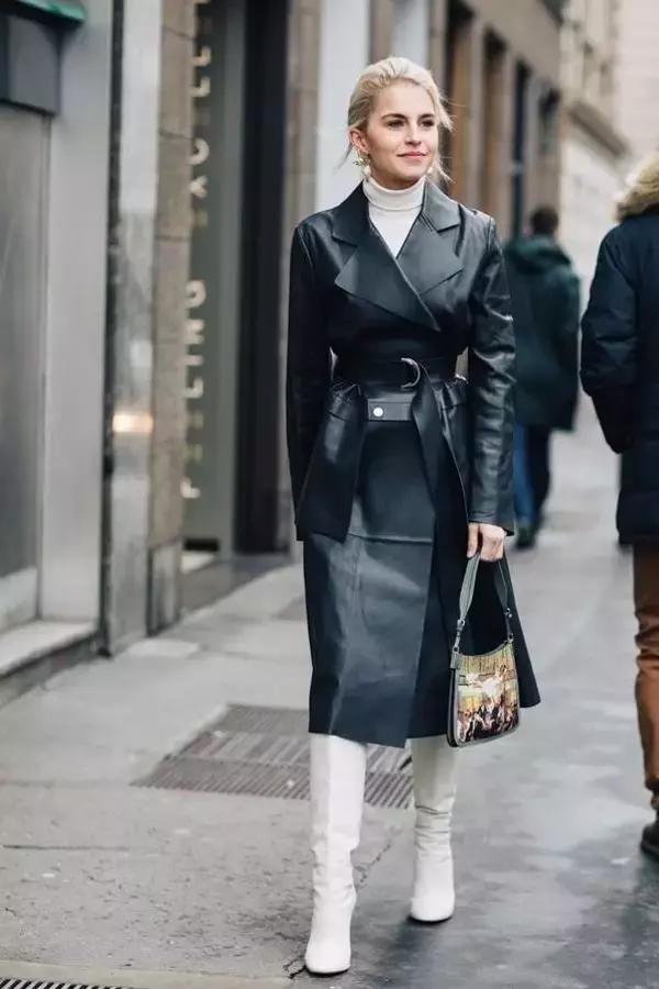 純黑色皮革大衣就高級簡約,更加的酷勁兒十足。內搭灰色高領,化身為朋克少女哈~
