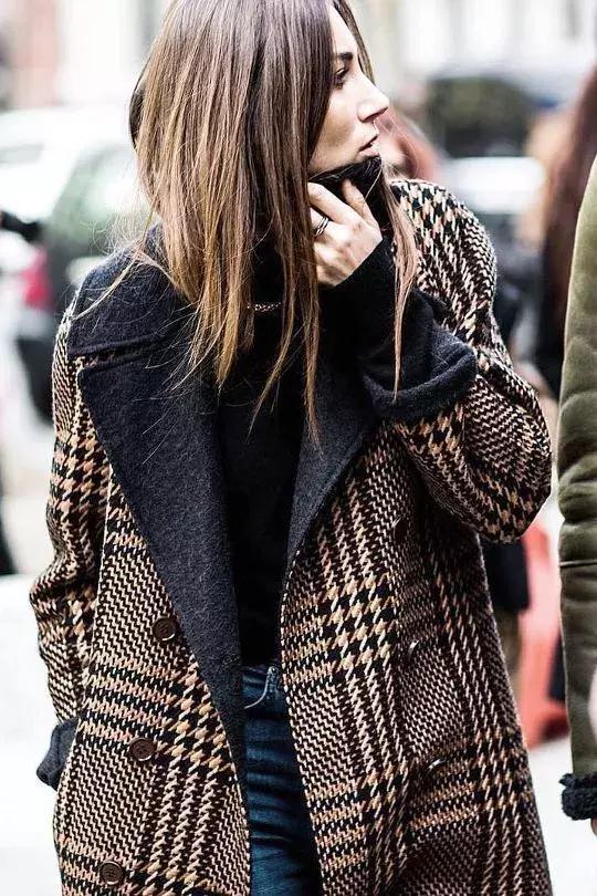 格紋大衣的風格非常明顯, 濃濃的學院英倫復古風,復古的格紋大衣內搭簡單的搭配高領衫就可以足夠簡約高級了。