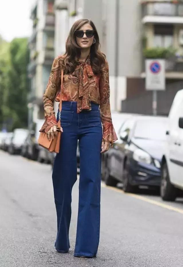 帶有復古風情的泡泡袖襯衫,用牛仔闊腿褲來搭配升級你的時髦感,襯衫可以選擇緞面或者雪紡材質的,更顯高級感!