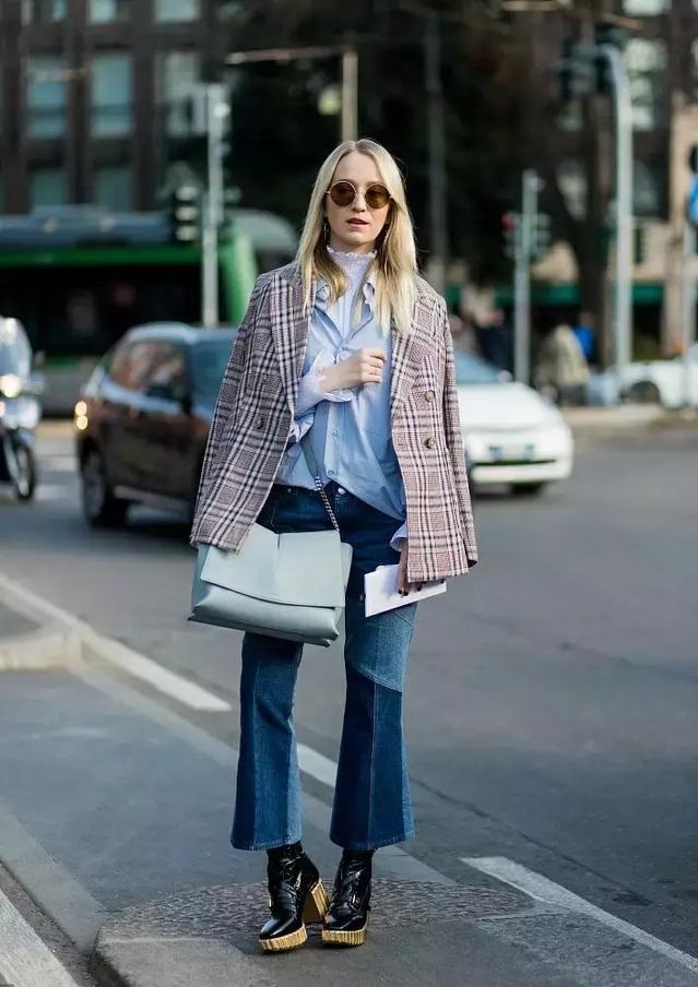 在闊腿褲的風潮過後,喇叭褲又火的不要不要的,一條九分喇叭褲搭配西服,簡直時髦的不費力氣~