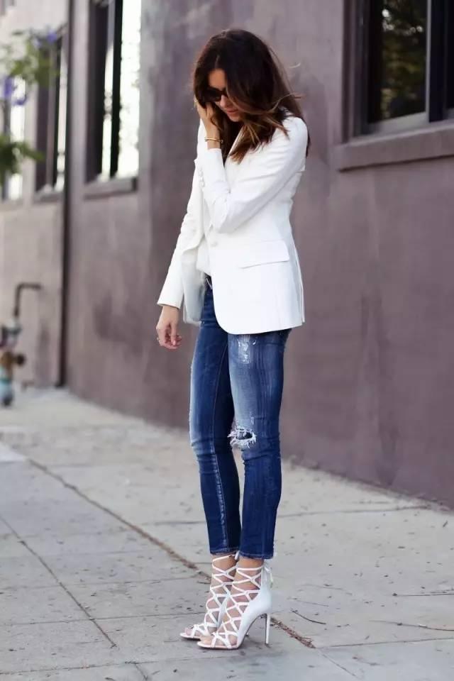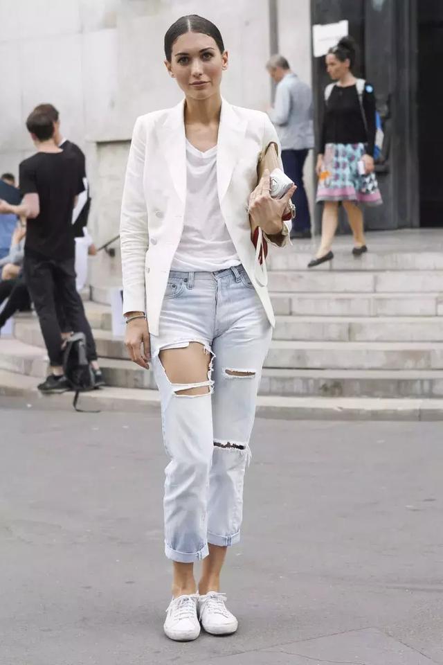 今年流行的磨邊牛仔褲搭配西服,時尚休閒~