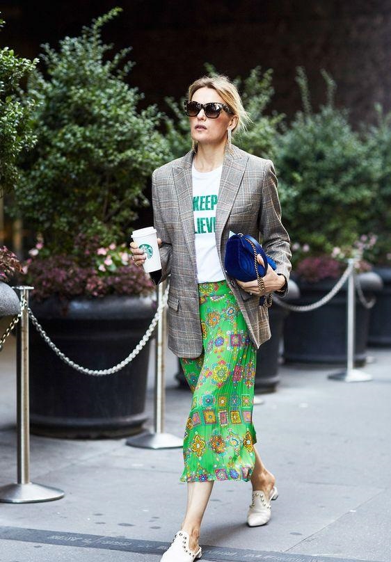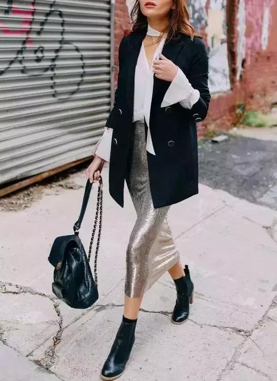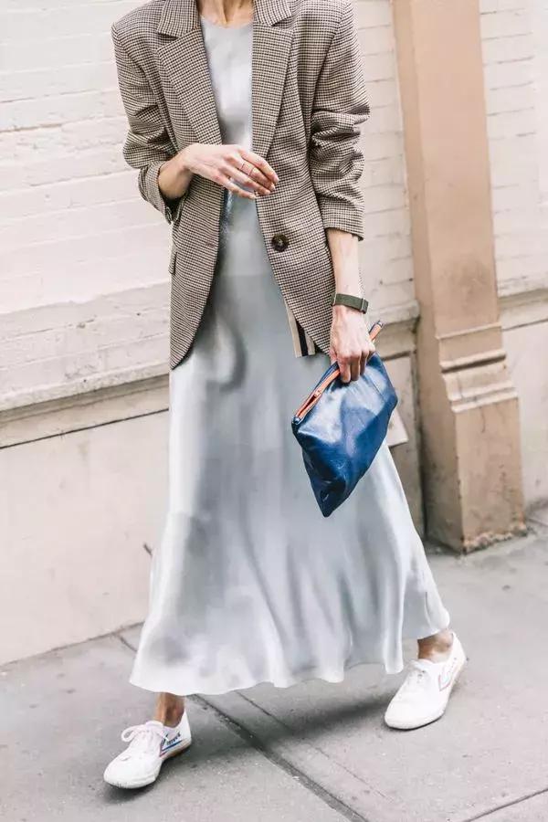 緞面的簡單高級氣質,出街簡直氣場開掛,不同於印花裙的是西服的選擇可以稍微修身一些,看起來更加幹練。
