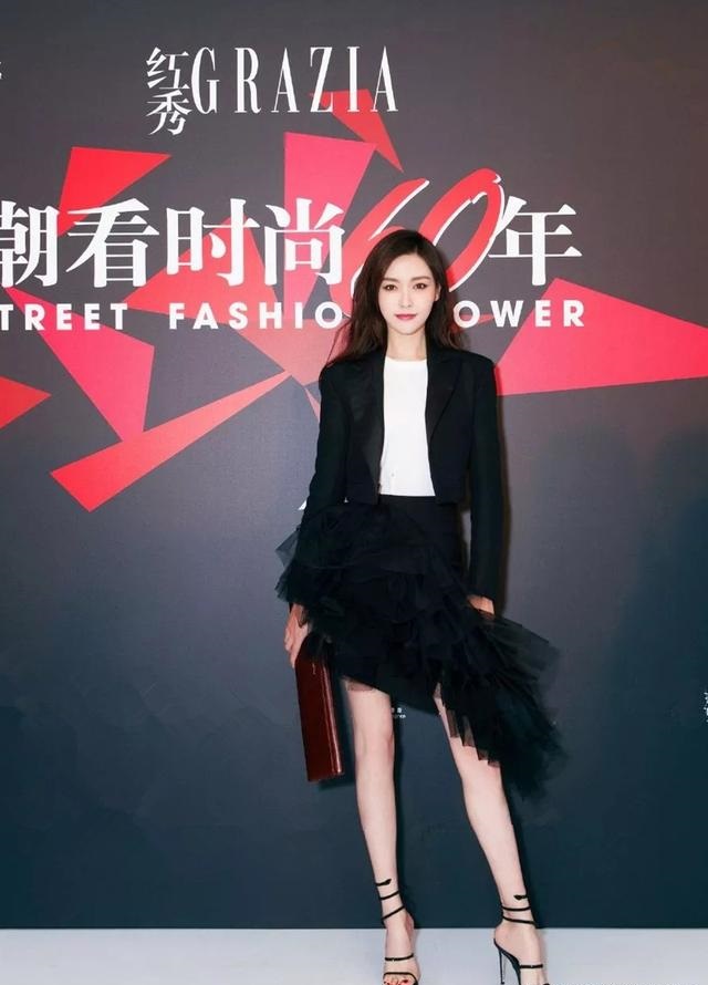 大表姐的看秀look,黑色仙女裙外加黑色西服外套,中規中矩,仙兒中帶點酷。