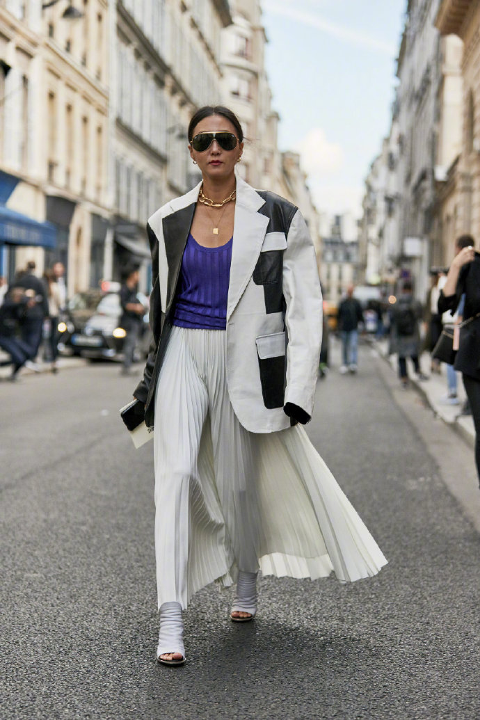 純色百褶裙是最百搭的一款,可以順色搭配也可以大膽玩撞色,各種場合都能hold住。