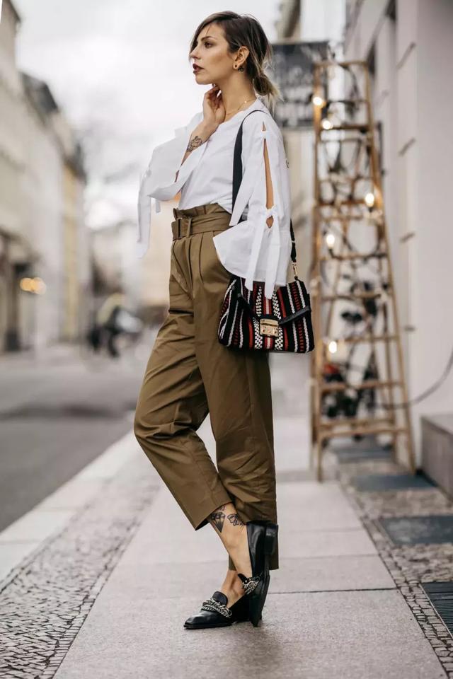 從去年就特別流行腰封,這麼前衛的單品,時髦精的最愛了,白襯衫和黑色腰封混搭,這簡直就是街頭的殺手鐧,個性前衛當屬這身look!