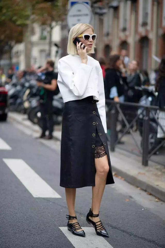 最不用思考的還是穿純黑絲襪進行打底,一雙帶有綴飾的瑪麗珍鞋就OK,搭配不用太過於復雜,簡單的黑白色調看起來溫柔而高級。