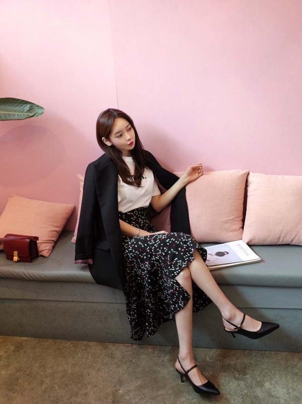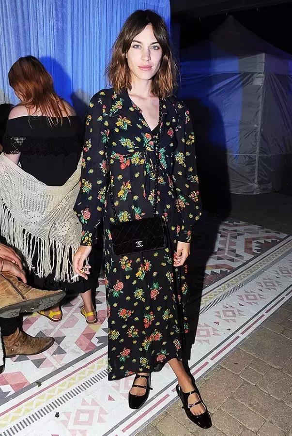 印花類的長裙很適合搭配粗搭扣、圓頭的瑪麗珍鞋,出太陽了可以穿上一套復古的拗造型。