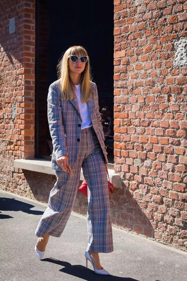 T恤和褲子同是白色,再披上時髦感爆棚的細格紋西裝外套,真的超顯高啊!
