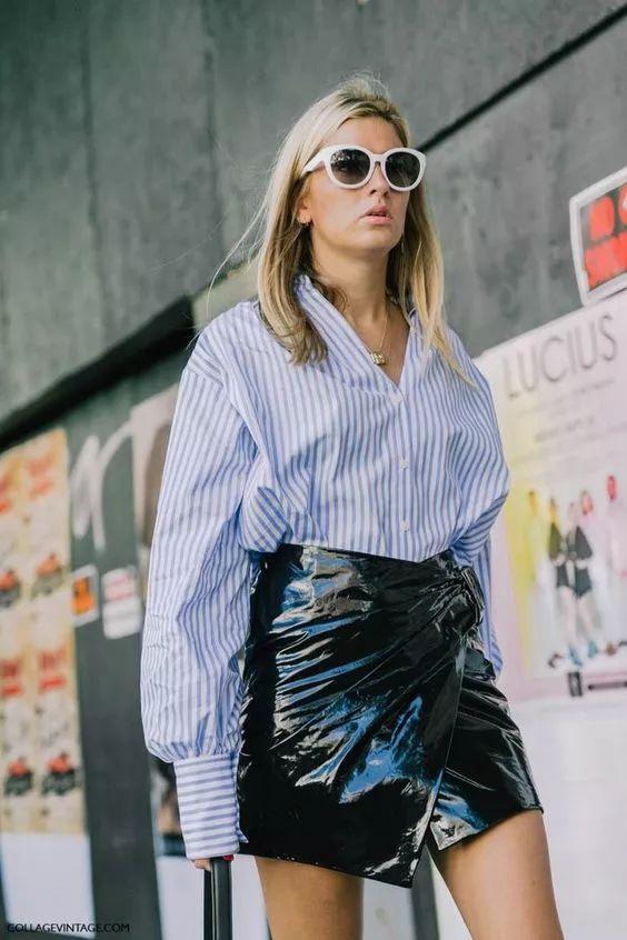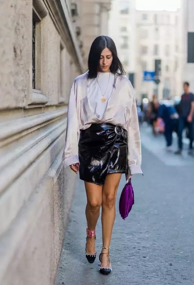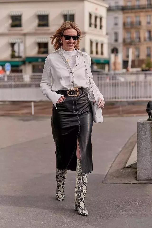 開衩鉛筆裙的選擇也很重要,緊身皮裙或者寬鬆布料,出來的感覺也會很不一樣。