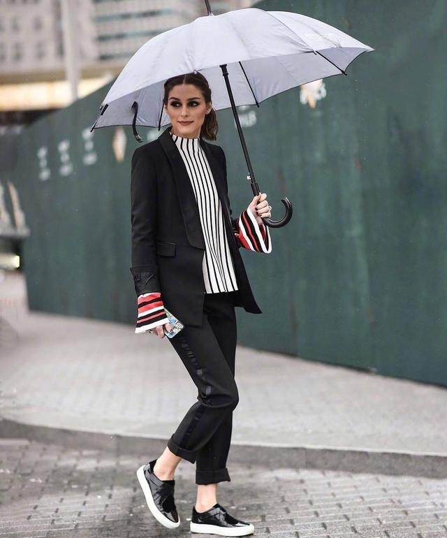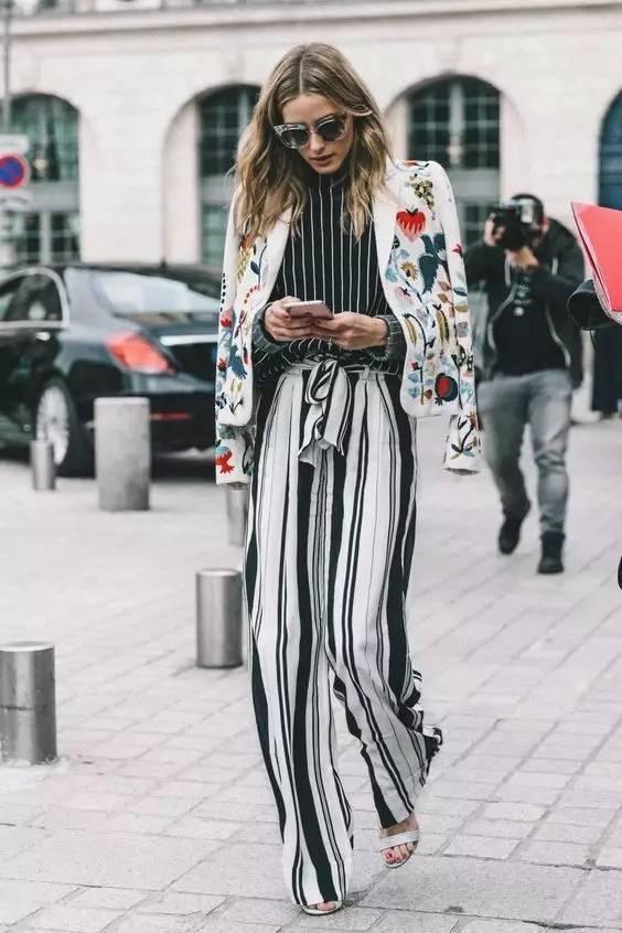 都說職場精英風必須要有闊腿褲這個元素,奧利維亞又用條紋元素詮釋了普通單品也能氣場強大的穿衣方式。