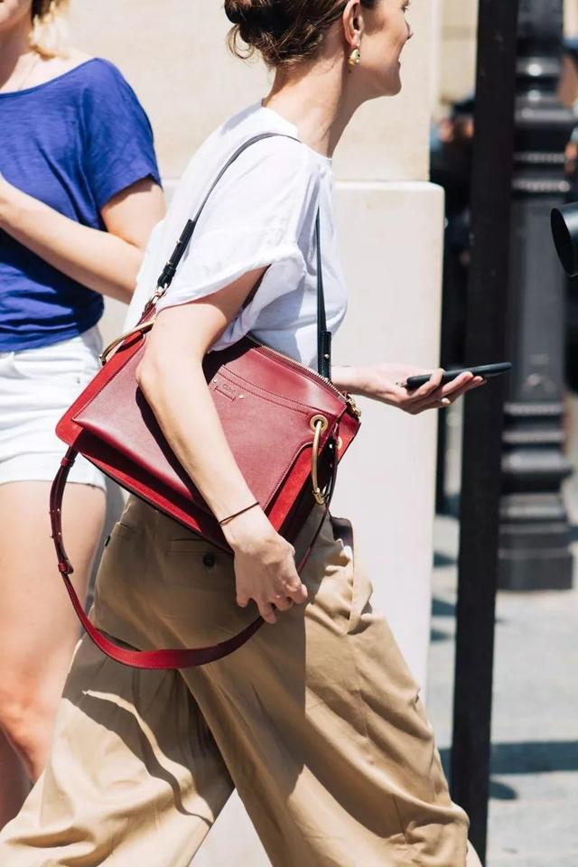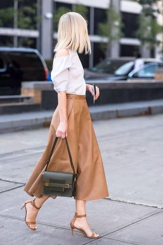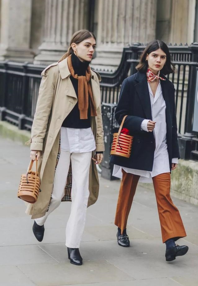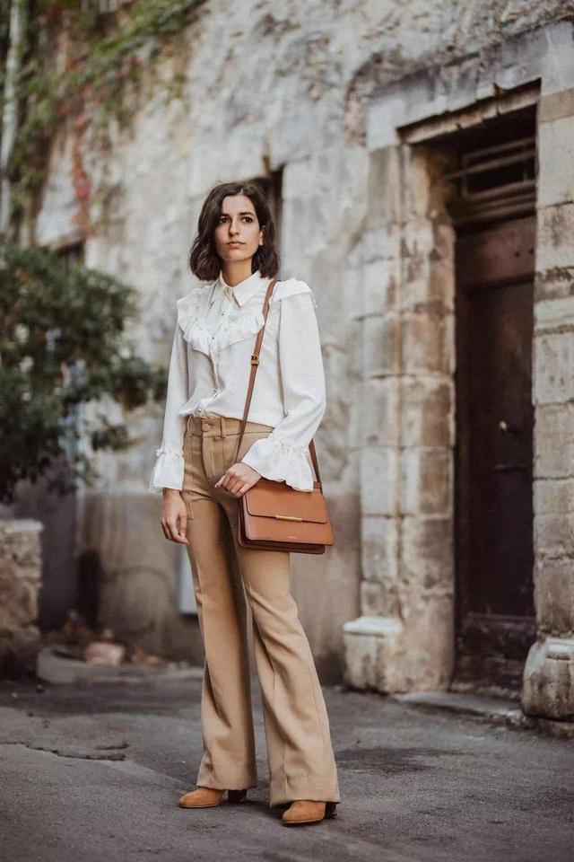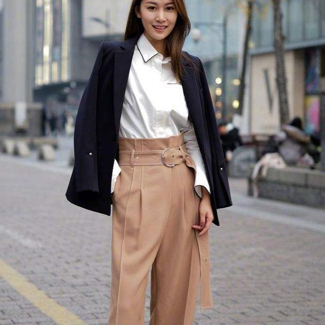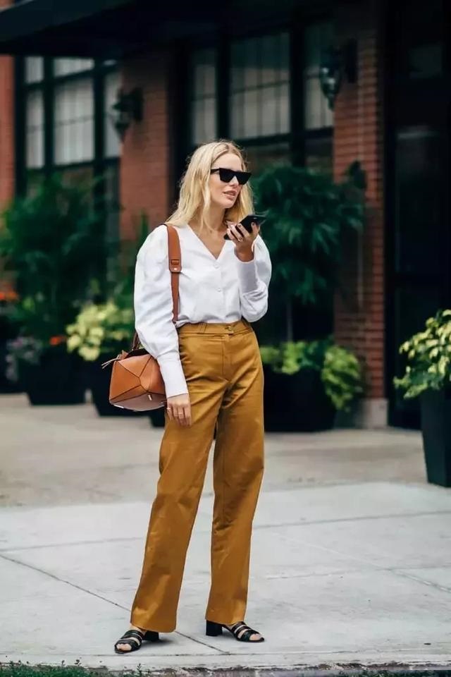 駝色是很有質感的顏色,特別是駝色系的褲子,質樸中帶著舒緩的舒適腔調。特別適合跟淺色調的米色或者白色來匹配,讓你不費力就能擁有好氣質。