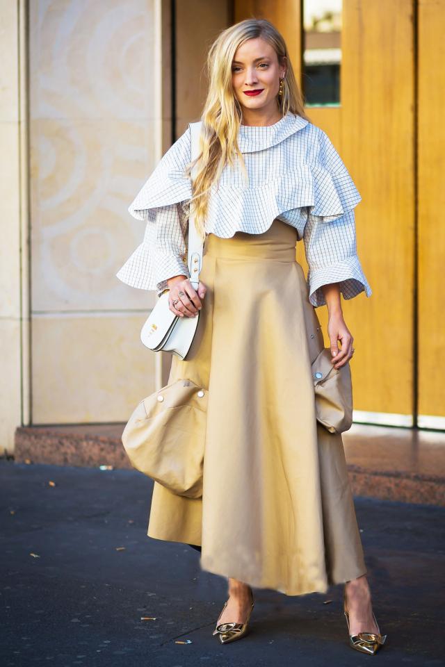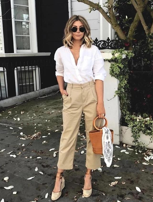 米黃色調的襯衫搭配九分利落褲子,用白色鞋子提亮,才是完美細節映襯。