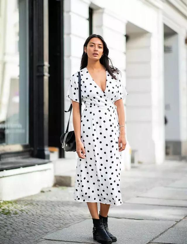 黑色的波點連衣裙自帶一種可愛甜美氣質,搭配一個圓邊帽子,更是多了一份休閒、灑脫、清新的氣息~裙子下擺處有點拼接式設計,像魚尾板,上身不但更加甜美動人,而且也更為飄逸,繾綣出屬於少女的優雅、清新、明媚。