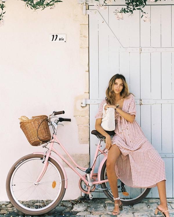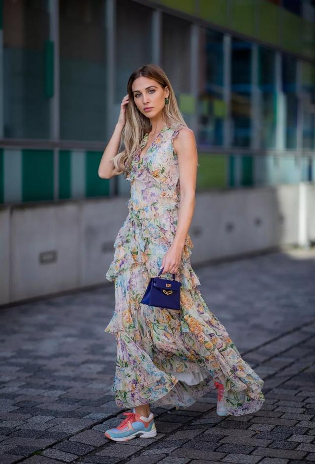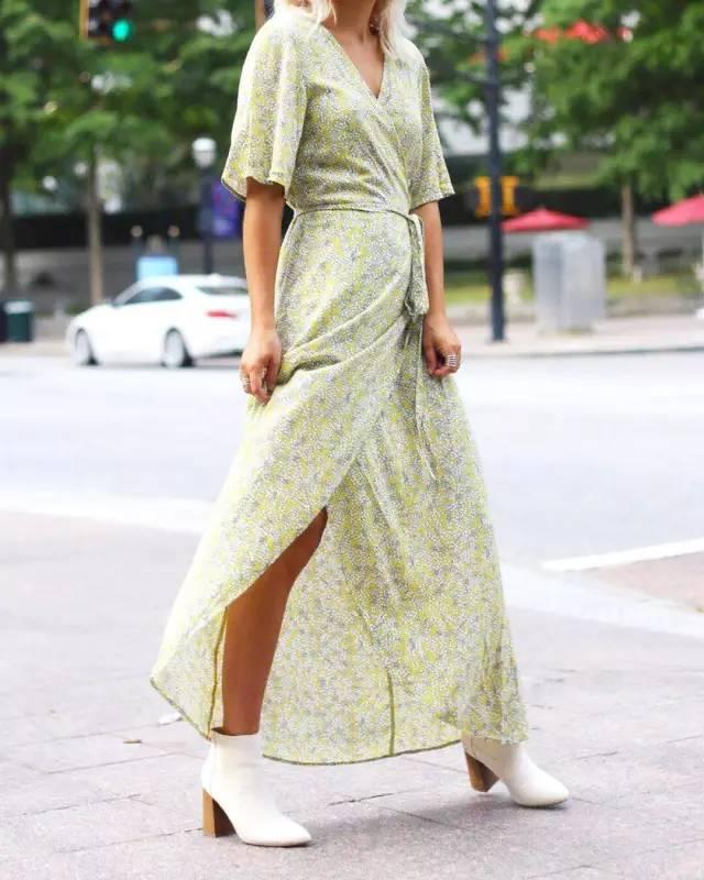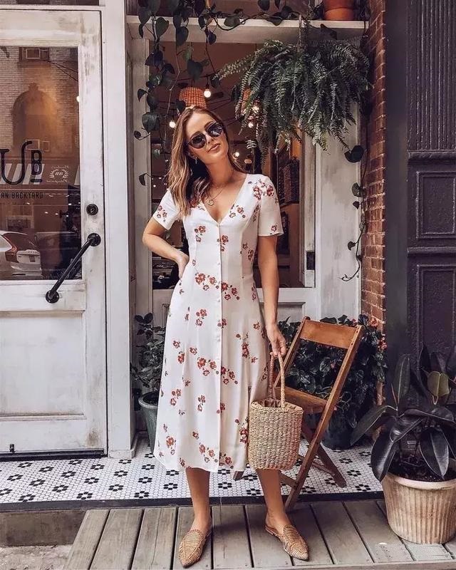 對於腰部有肉或下半身比較粗壯的女孩子來說,這種A字型的長款連衣裙是最為顯瘦變美利器~裙子是精緻碎花圖案的,帶著一種原野的清新感,尤其是再以一個竹木編制手提包包作為點綴,整體造型格外浪漫,質樸不失時尚感。