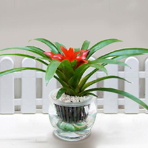 1、水培鴻運當頭一般準備飽滿的玻璃圓形花盆,上面帶有塑料支架,把鴻運當頭裝在塑料支架上以後,放在容器中,然後給瓶中加入清水進行養護即可。