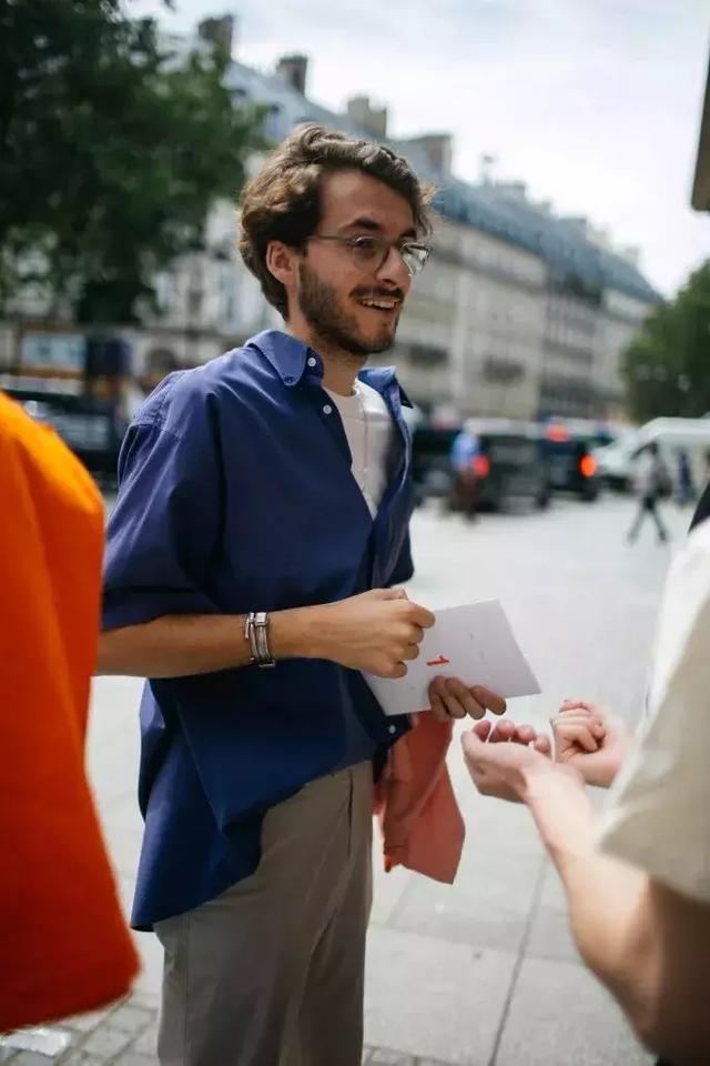 在襯衫外搭件輕薄的馬甲,坦露的胸襟有意無意的散發出剛性的荷爾蒙氣息,下搭的Chino Pants在這時便顯得恰到好處,挽起的褲腳和褲褶在正經和街頭風格里徘徊,不費吹灰之力的營造出性感不羈的感覺來。