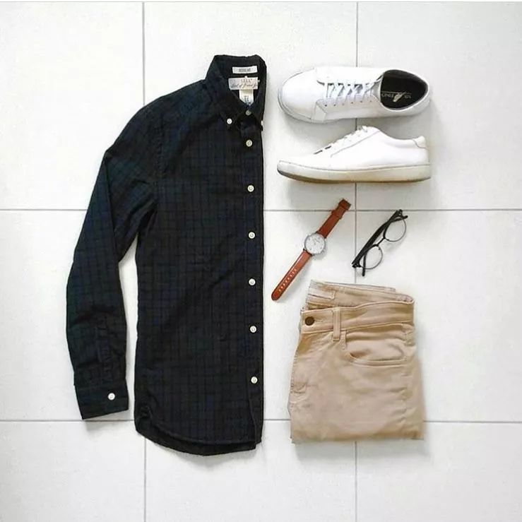 今天給大家推薦的搭配是深色襯衫+小白鞋。黑與白這兩個顏色,不但經典也都非常的百搭。