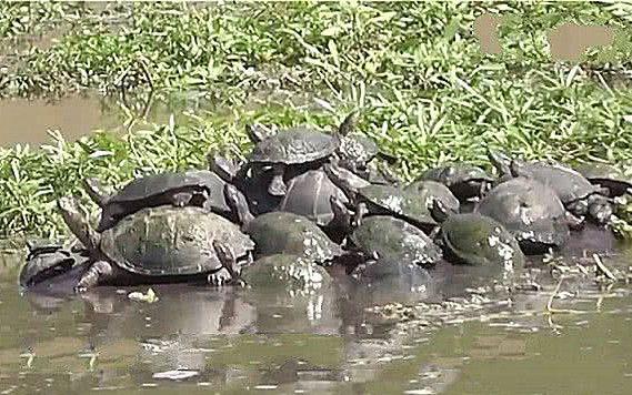 所以要珍惜還能看到野生動物的日子呀。一名男子在野外就遇到了一件有意思的事兒,他在河邊發現了十幾隻烏龜堆在一起,挨個兒擠著都擠成了一座小山,出於好奇男子就靠近去看個仔細。