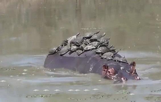 原來這群烏龜是趴在人家河馬身上休息曬太陽呢,哈哈哈,獸醫小明也被這有趣的一幕逗得合不攏嘴,莫名覺得太和諧太可愛了,這可不就是滴滴打牛車嘛,哦不,是打船哈哈~