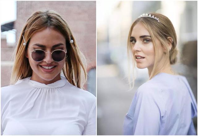 想要更加日常的話可以選擇這種裝飾在尾端的珍珠發卡,金屬感的發卡和珍珠相碰既溫柔又帶著一丟丟的酷感,而且一顆小小的珍珠就可以很好地點綴整個造型。更接近王冠造型的珍珠髮箍也是一個很好的選擇,髮箍上的珍珠大小不一的排列會更加活潑有設計感,裝飾在頭上非常亮眼吸睛。