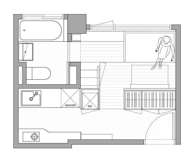 平面佈置圖,原本是一家鋼琴工作室,後來被改造成住房。17.6平的使用面積,3.4米的挑高樓層,裝飾方案有助於小空間流動,改造後重新分配空間,提高空間利用和儲物。