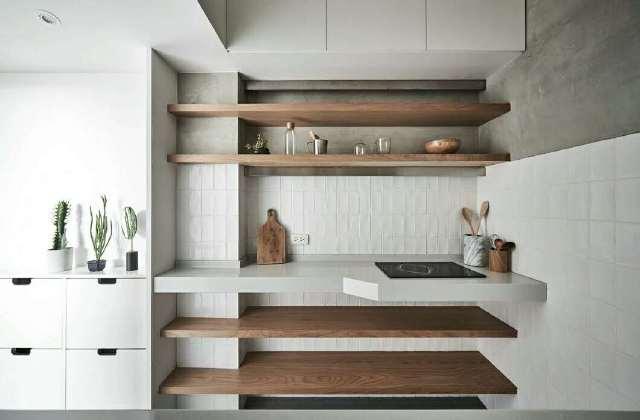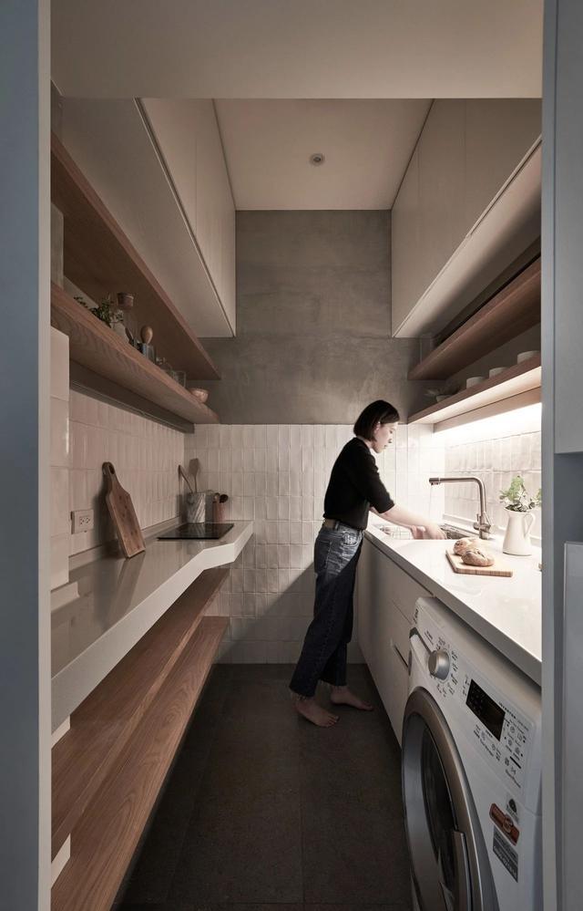 廚房雖小,但設計不含糊,單邊櫥櫃+吊櫃+隔板為廚房提供了足夠的儲物空間,視覺上不會過於擁擠。射燈和隱藏燈帶確保了廚房照明,家電採取嵌入式擺放,歸整美觀不影響使用。