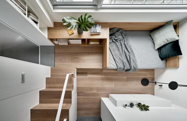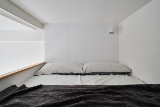 臥室全貌,並沒有復雜的裝飾,床墊尺寸剛好合適,邊緣到邊緣。開放式的空間設計,確保了臥室通透採光。壁燈和臥室色調保持一致,整體效果美觀協調。看完這套小戶型設計,是不是覺得很贊,面積雖小但該有的功能一樣不少,而且顏值和收納都很不錯。所以房子麵積不是問題,關鍵在於設計。