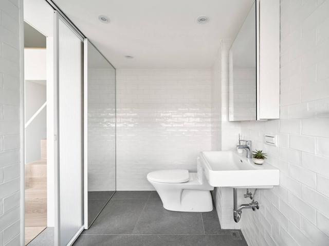 衛生間緊湊實用,大量使用白色瓷磚提昇明亮程度,減少空間壓抑感。滑門採用鏡面,延伸視野以達到擴大空間效果。置物架設計很巧妙,隱藏於滑門之後,實用美觀兩不誤。懸掛式洗臉盆,簡潔佔用空間少,適合面積不大的衛生間。