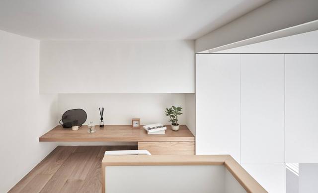 挨著樓梯口的角落空間,定制簡易桌,桌面和抽屜位於橫樑下方,一個小型室內植物和一個台鐘,簡單又好看。即可以是書桌也可以是梳妝台,一舉兩得。