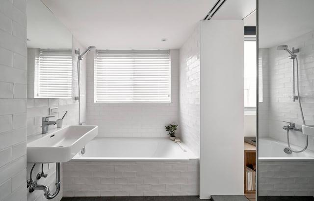 根據尺寸選擇合適的浴缸,白色瓷磚覆蓋衛生間每面牆,並與浴缸相匹配。窗戶為潮濕的空間提供了良好的通風和採光。