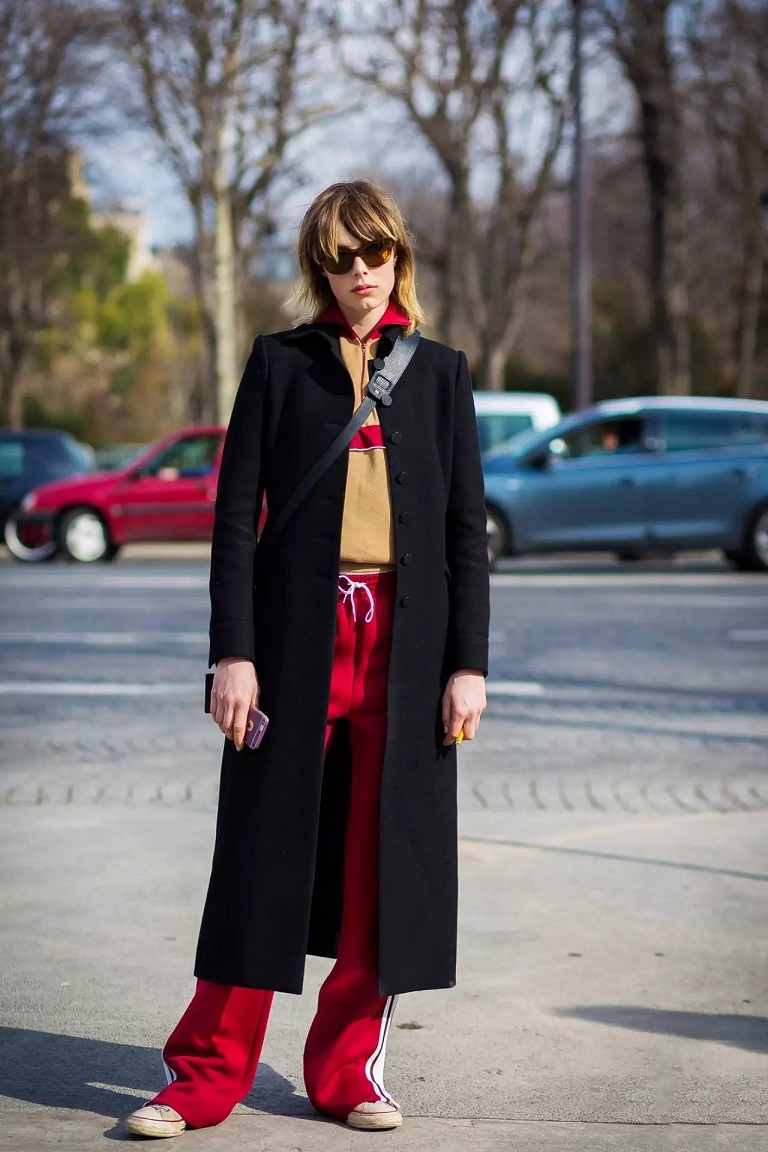 大女人風的代表——拖地褲,被人戲稱為街頭掃地機器的它,仍是時髦精們的寵愛,和同樣具有女王范兒的黑色大衣搭配,相得益彰。