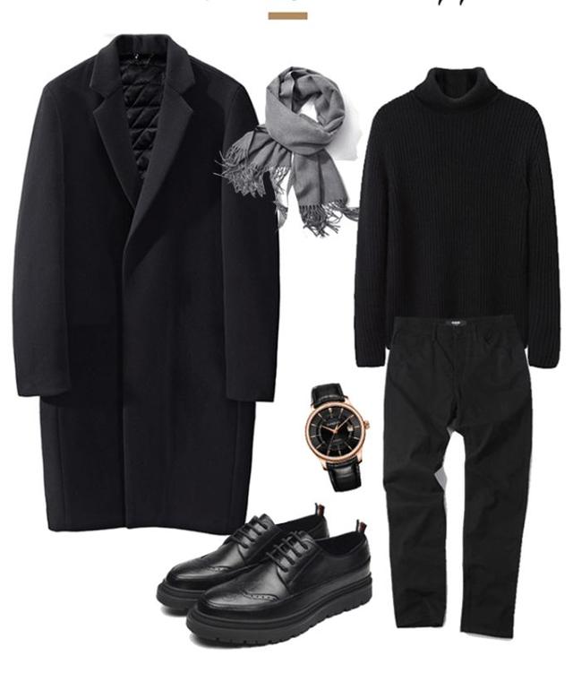 內搭黑色高領毛衣是常見配色搭法,不喜歡西褲的同學可以換成深色系休閒褲或者牛仔褲。給人柔軟暖和的感覺。