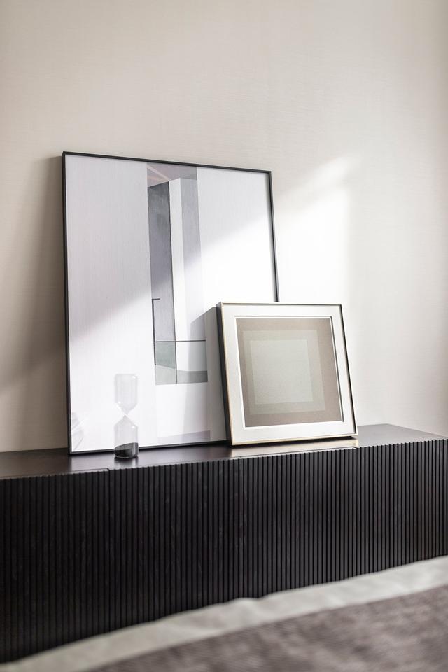 以現代拉絲工藝打造的矮櫃,擺放上兩幅抽象藝術畫,無須太多的修飾,自成一道極具藝術感染力的風景。