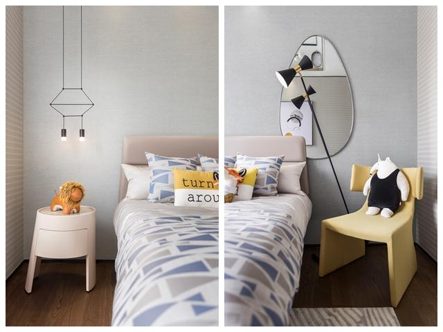 男孩房簡約不失個性。床頭吊燈、鏡面裝飾、單椅、床頭櫃,每一個軟裝元素都釋放出其本身的獨特性,來讓空間顯得更豐富且有趣。