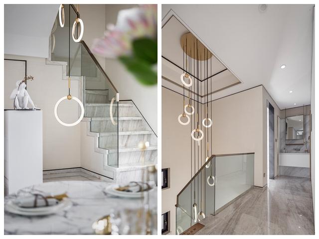樓梯是連接上下空間的重要環節,此處運用大理石鋪設台階,配合著通透的玻璃扶手和米色牆漆,營造出有序、和諧的視覺空間。從樓梯頂面垂落下來的圓環吊燈,已經超出基本照明的作用,成為空間中最具藝術感染力的絕美風景。