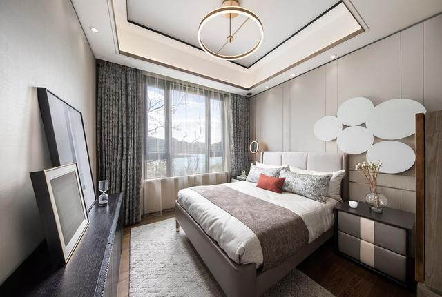 次臥是對主臥的延續,但又在燈飾、牆面裝飾的細節上,與主臥又進行著區分。