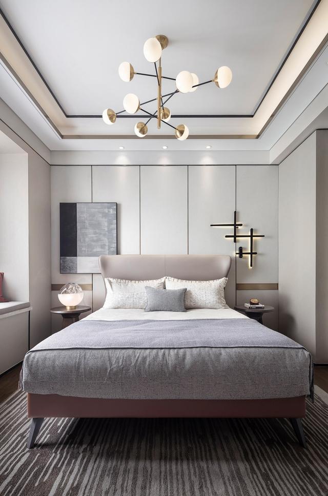 主臥是一個追求靜謐的空間,此處沒有過多的色彩,簡約純碎的淺色調,讓空間漸漸舒緩下來。以硬包打造的床頭背景牆,打破傳統的對稱式設計,以金屬吊燈+牆面個性裝飾,凸顯出空間的個性與時尚。