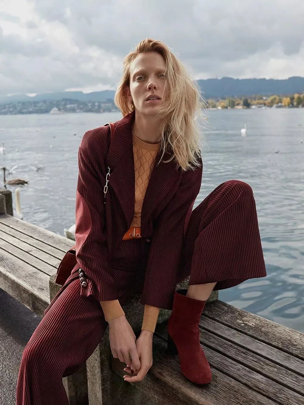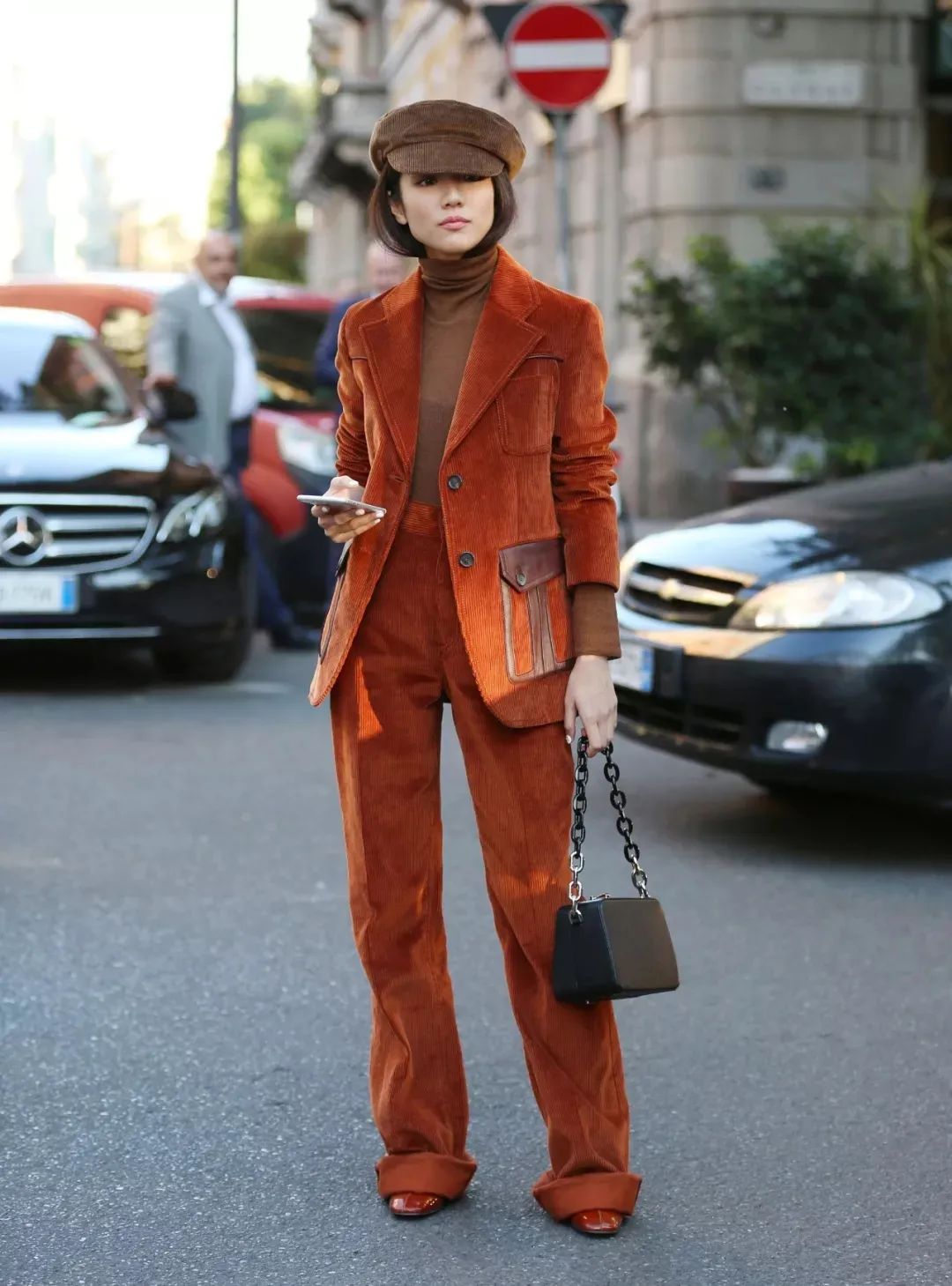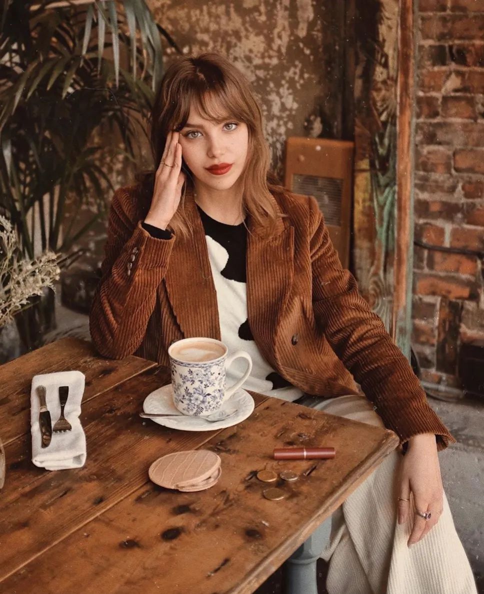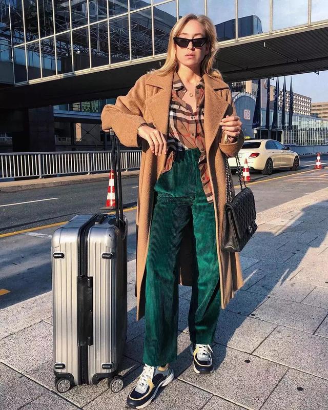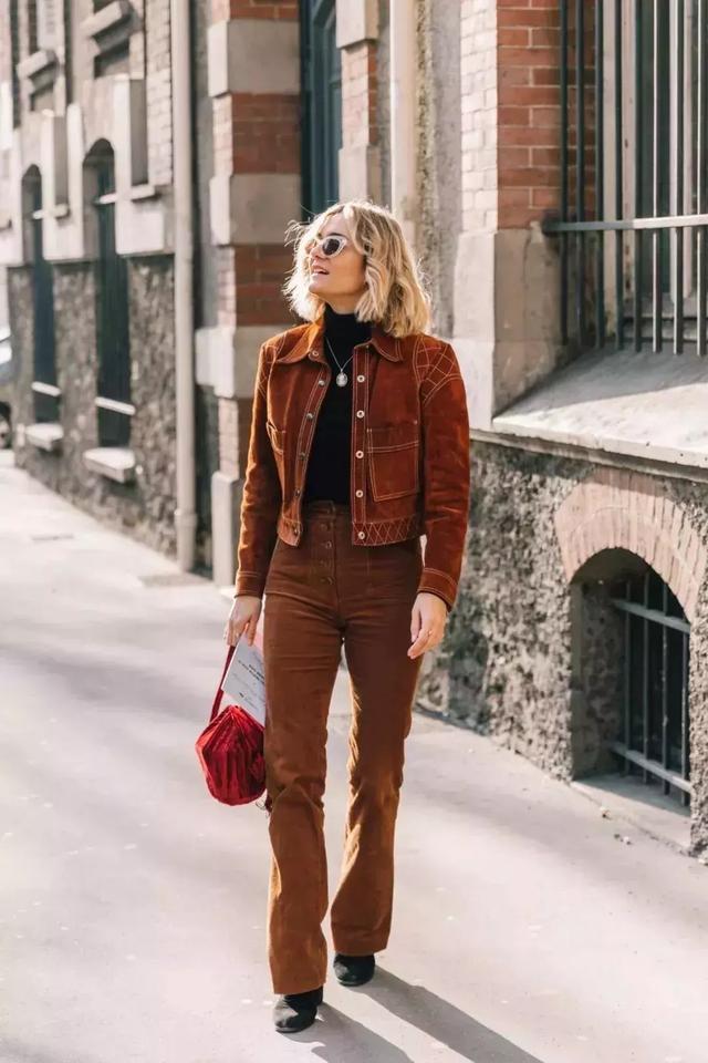通常來說焦糖色、酒紅色等這種顏色比較深的燈芯絨褲裝是比較好駕馭的款,既能營造出腔調十足的複古氣息,還格外顯高顯瘦。