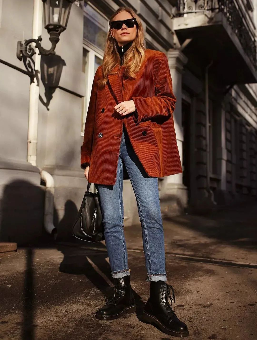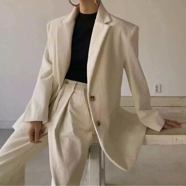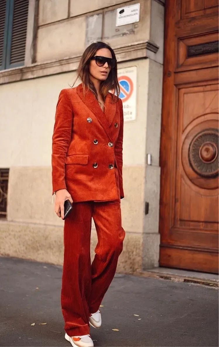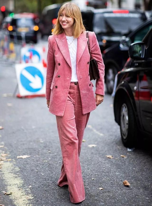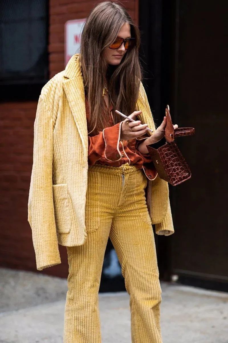 燈芯絨套裝常見的是西服套裝,屬於不費腦穿搭,輕鬆化身時髦精~特別是遇上拖地的闊腿褲,豎向的坑條可以從視覺上完美拉伸腿部線條,看上去增高不少。