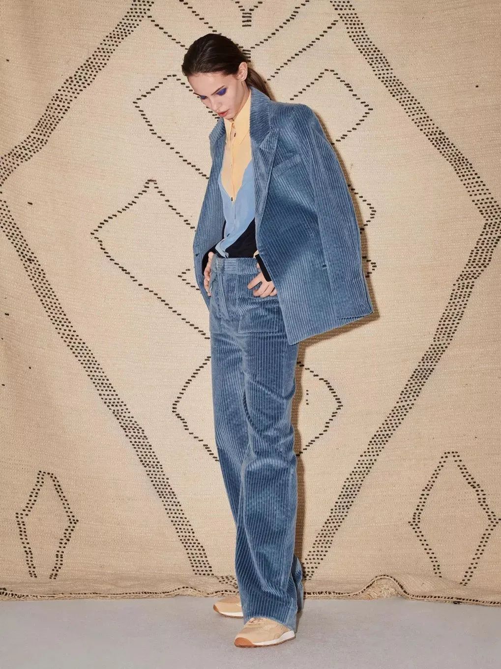 成套穿搭配解決亮色帶來的搭配尷尬,而且亮色系的燈芯絨套裝更顯年輕,去掉西裝的沉悶,賦予溫柔和煦的色彩。