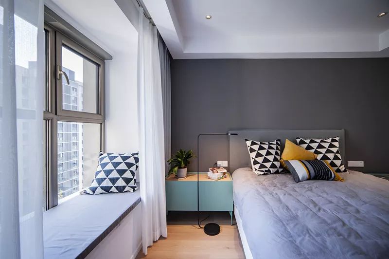休息區臥室飄窗比較普遍的佈置就是在飄窗檯面上舖一層軟墊,放上靠枕做一個小小的休息區。閒暇時間可以靠坐在上面看書,玩手機,或是看看遠處的風景,非常舒適。