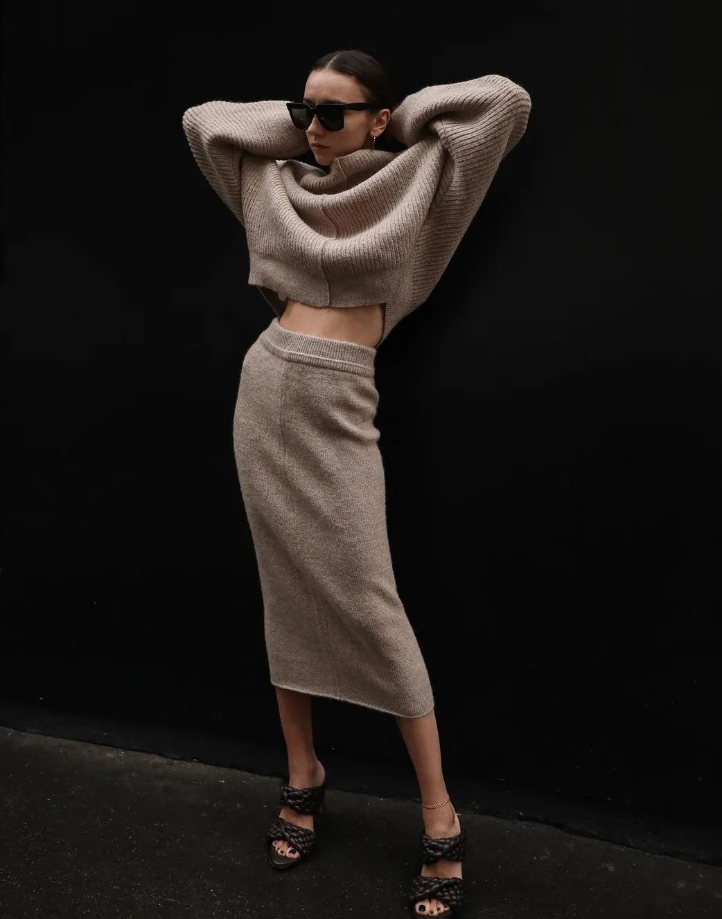 在拿不定針織裙套裝該穿什麼版型的時候,可以按照上短下長、上寬下窄這兩個公式去挑選。