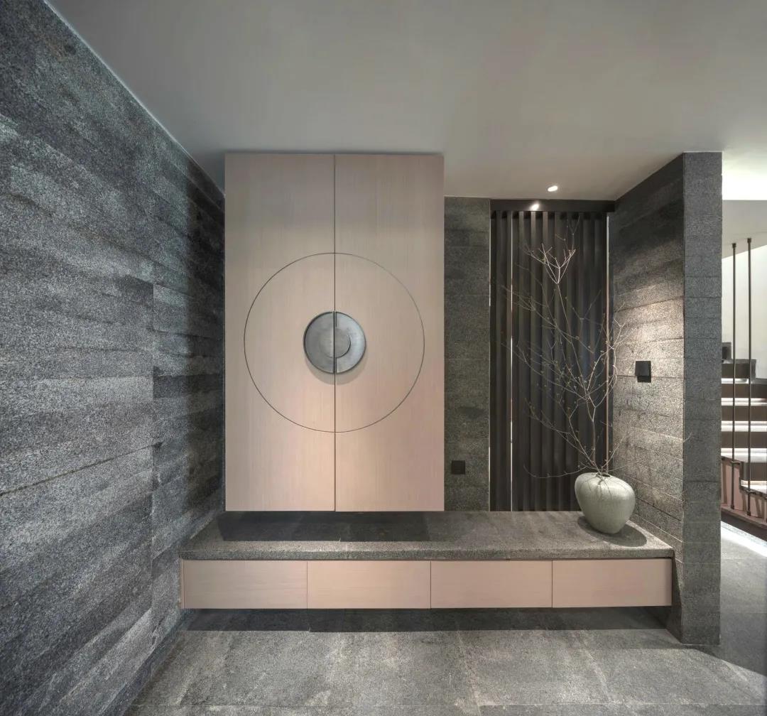 一花一世界,一葉一菩提。帶有顆粒感的玄關灰色地牆磚搭配原木色鞋櫃,輔以陶罐枝丫的點綴,如置身於一個悠揚獨立的精神世界。設計上多次採用圓形或弧度元素裝飾點綴,見證清淨之地。