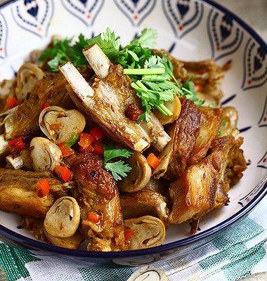 1. 羊排洗淨,切成小塊。洋蔥留出20克切末,剩下的切成大塊,紅椒切丁,草菇對半切開並焯燙備用。